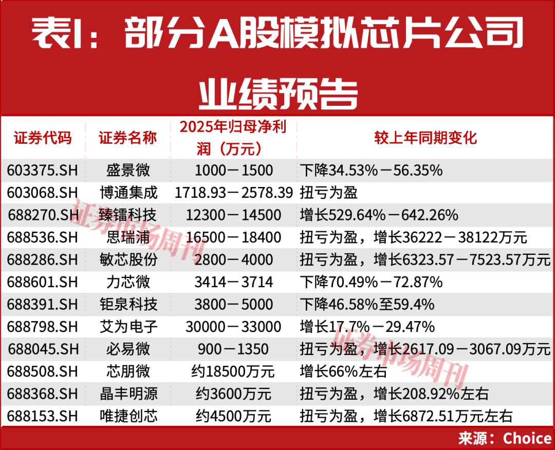 随着近两年存储芯片涨价潮带动,模拟芯片价格逐渐企稳。2025年业绩预告显示,多家模拟芯片厂商业绩大增或扭亏为盈。