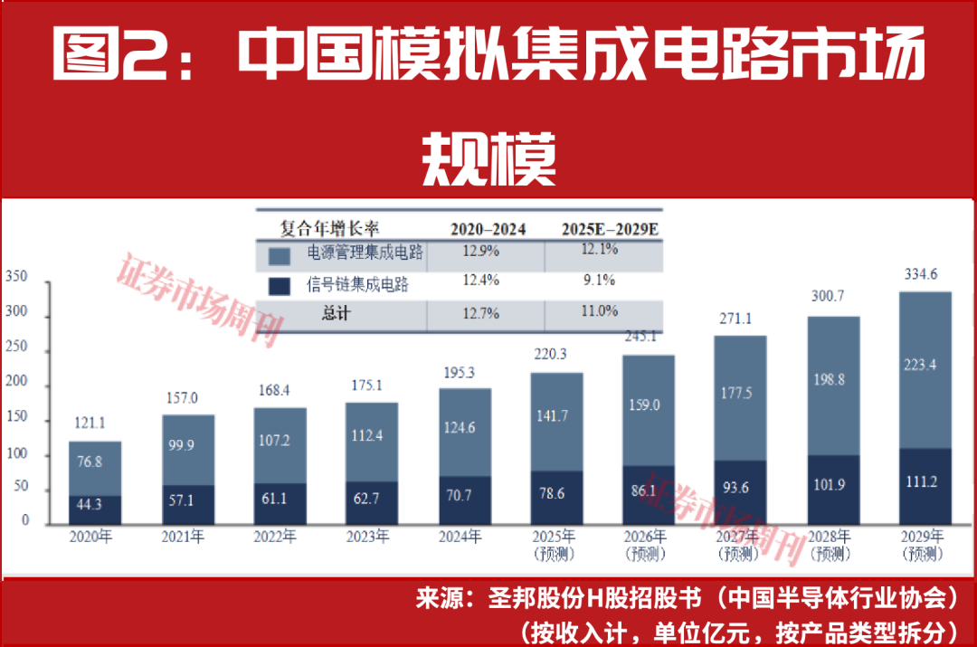 另据纳芯微H股招股书,依托新能源汽车的发展和自动驾驶技术的进步,汽车模拟芯片是成长最快、技术门槛最高的领域之一。2024年,智能新能源汽车模拟芯片应用的平均单车价值在1500元-2800元之间,预计到2029年,汽车产业电气化和智能化的深度融合将大幅推动模拟芯片的平均单车价值增长至2200元-4000元。2024年,模拟芯片在汽车应用领域的市场规模达到371亿元,预计到2029年,相应的市场规模将扩大至858亿元。
